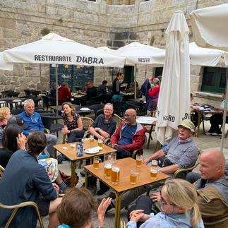We left the Cathedral and soon joined a group of our Primitivo pals who had congregated at a terrace nearby. What joy to see them all again! We were welcomed with a hearty cheer and were soon swapping tales of our last kilometers, how much we missed the peace and companionship of our time in the Asturias 'mountains' and our various stressed out joints and feet. A day later Sue and I met with a few friends over dinner and I had the pleasure of sitting beside Cornelius, a Dutchman well into his seventies who announced this was his last Camino - his seventh. He spoke with such feeling about the joy of walking and of being a peregrino. Germans, Dutch, Danes, Spanish, Irish - all with walking as a common thing in their lives. So foreign to our North American mentality.