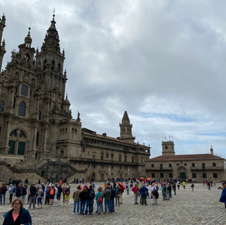 We had a short walk into Santiago de Compastela on May 6 - only 7 k. We were up early and began our walk around 7:30am and were blessedly on our own for most of the walk into town. That felt surreal given the hordes we had been with. Locals were setting up market stalls on the street that lead into the old centre of town ending in the large square in front of the Cathedral - the ancient end of the pilgrimage. It was overcast and a light rain fell as we entered the large square. Tourists milled around, other peregrinos and soon a Disneyesque choo choo train tooted through the square carrying sightseers. We soon made our way to the office where we got our certificates authenticating we had indeed completed the Camino - we were numbers 158 and 163 for the day. Sue admitted to shedding a tear when the official stamped her passport for the final time.